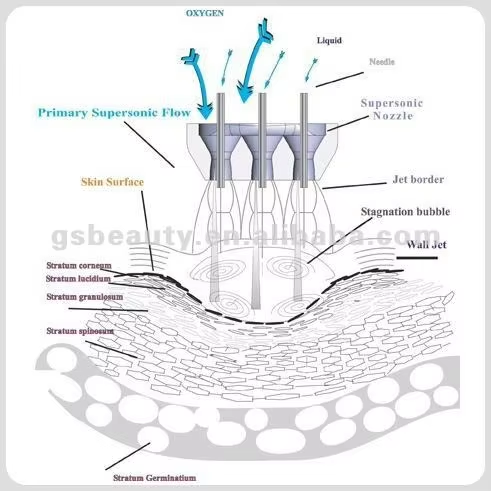 Oxygen injection system for skin and scalp can be treated in Jet Mode and Spray Mode.